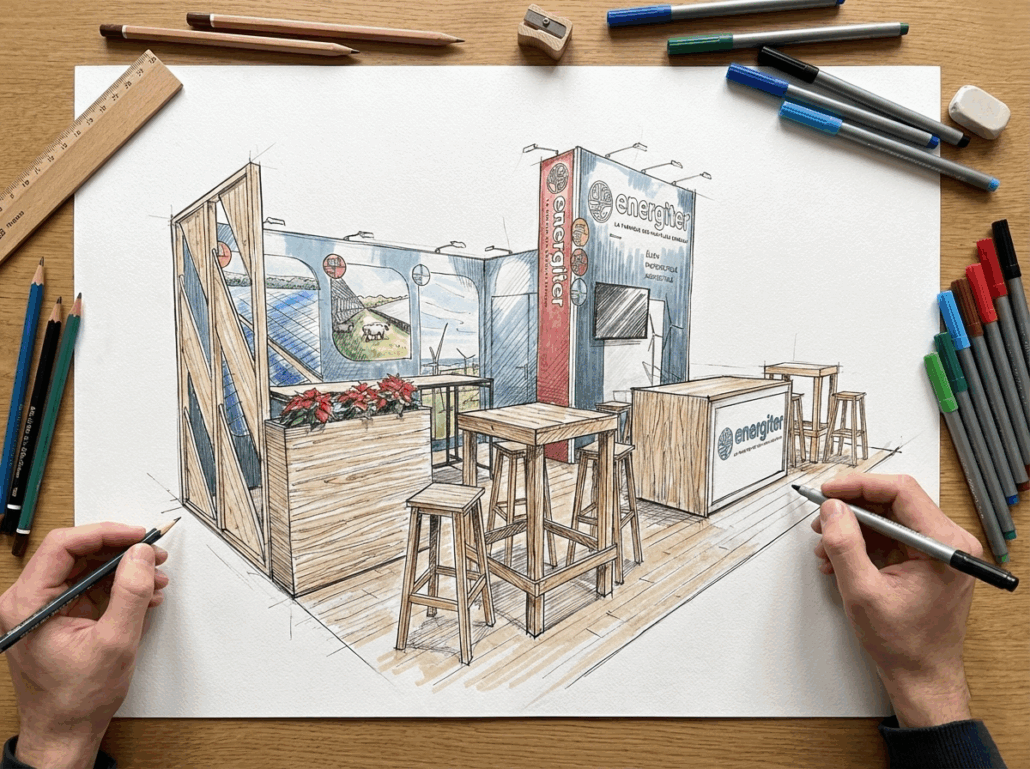 Transversale vous accompagne dès la première phase de votre projet de stand : La conception et la recherche de solutions adaptées à vos besoins.