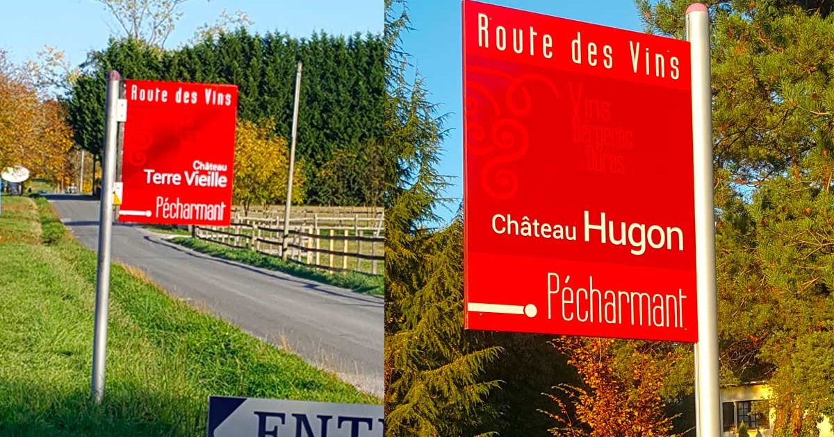 Fabrication et installation des 120 enseignes extérieures pour la route des vins de Bergerac et Duras. Fabrication en atelier et installation sur place, chez chaque vigneron, sur poteaux existants.